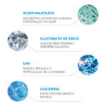 Sais de Zinco: controla a produção de queratina, desobstrui os poros, reduz a ocorrência de acne e regula a oleosidade cutânea.